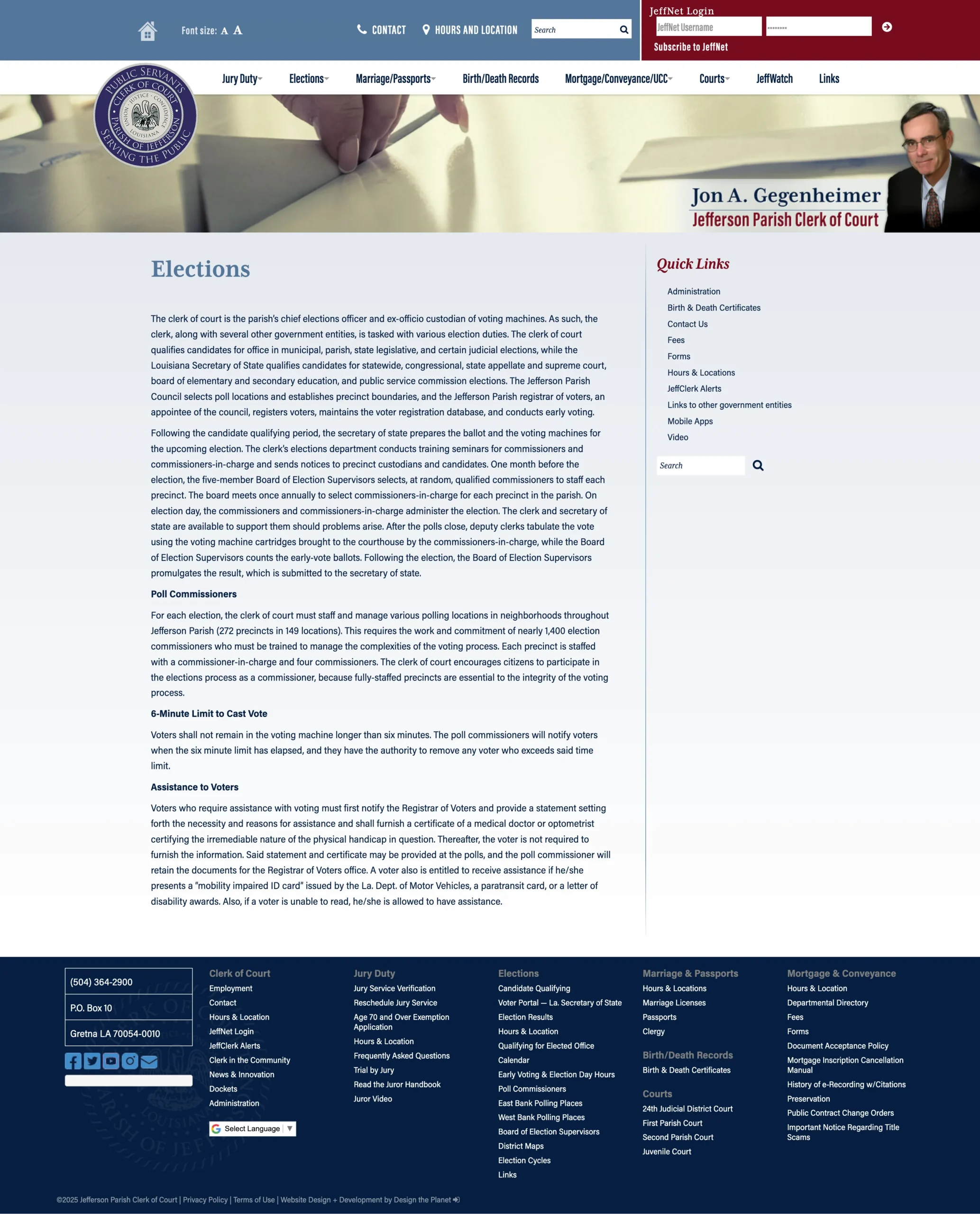 Design the Planet designed and developed a custom website for Jefferson Parish Clerk of Courts, featuring pages such as the Home page, Jury Service, Birth & Death Certificates, Elections, and Contact Page.